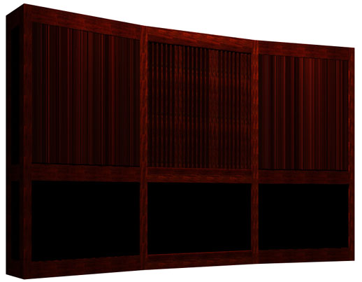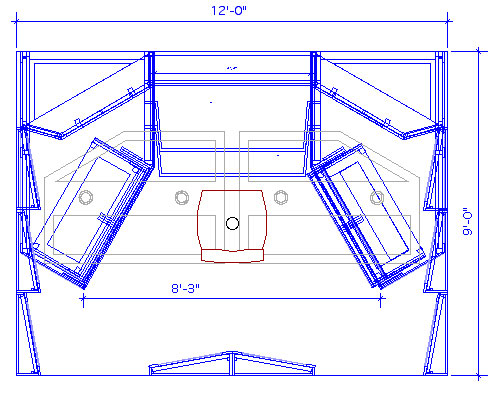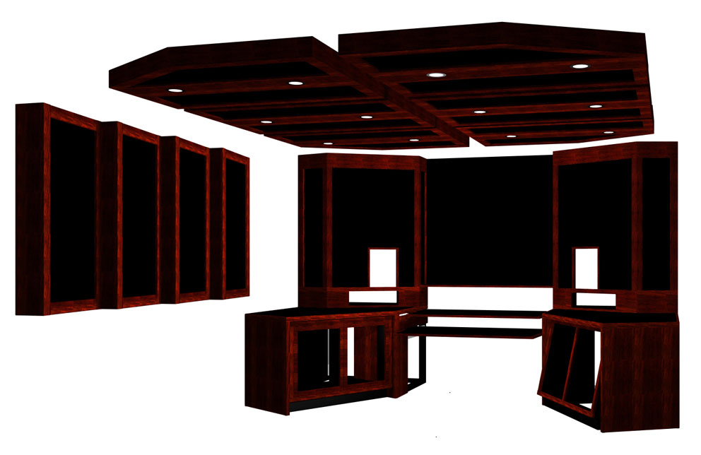 The Evenfall Modular Studio System The way we work has changed. Where we work has changed even more. Evenfall Acoustics, Ltd. introduces a modular interior system that can help transform an ordinary rectangular room into a reasonably accurate studio environment. The complete system consists of 26 individual furniture units that integrate acoustical components and workstation furnishings. The system can be purchased as a complete room or in sections. FEATURES: WORKSTATION: Two sliding shelves are user configurable and can accommodate instrument keyboards on the bottom and console/control surfaces on the top. Shelves are sized for any console similar to Digidesign's Control/24 or Sony's DMX-R100. The keyboard shelf slides under as the console is pulled out into the room for mixing sessions. A third shelf accommodates video monitors and/or monitor arms. The upper center panel can also mount plasma displays and LCDs. Two cabinets can roll out from under the side desk units to reside in the room if desired. This allows for more seating area at the desks. One roll out cabinet houses the CPU and hard drive quiet bay and provides sound isolation from any gear producing cooling fan noise. The second roll out cabinet contains 24U of rack space. When these cabinets are under the desk unit, they are ventilated through the soffit unit which sits above. The monitor soffit units contain panels that are custom cut to fit a variety of popular monitor speakers. These units also contain bass traps and broad band absorbers. CEILING ACOUSTICAL CLOUD SYSTEM: Cloud units contain broad band absorbers and come with recessed low voltage light fixtures. The light fixtures can plug into any existing ceiling fixture. BACK WALL UNIT: Consists of 6 sections that contain bass traps and QRD type diffusers to provide a highly diffused rear field characteristic. SIDE WALL UNITS: Individual hanging units can mount either broad band absorbers or diffusers. Units are angled to counteract parallel wall surfaces. System is available in Mahogany, Oak, Maple or Cherry. A wide range of insert panel fabric colors is also available. PRICING: TBA |